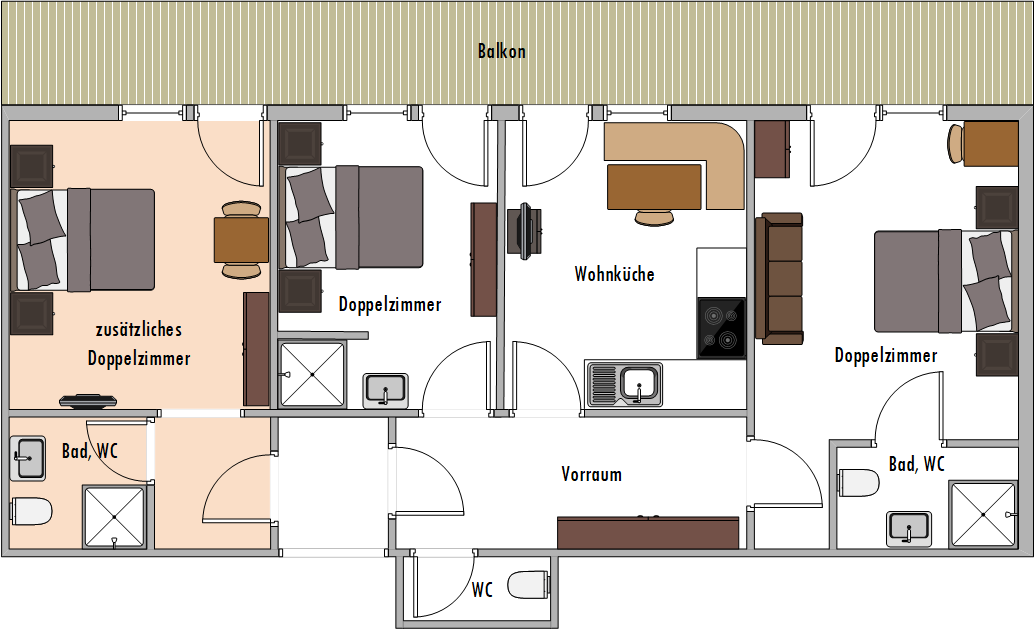 Unsere Ferienwohnung Sonnalm befindet sich auf der Ostseite unseres Hauses und ist für 4 – 7 Personen vorgesehen. Standardmäßig hat dieses Apartment eine Größe von 65 m². Bei Bedarf kann die Ferienwohnung um ein angrenzendes Schlafzimmer erweitert werden. Dann ändert sich die Wohnfläche auf 85 m².